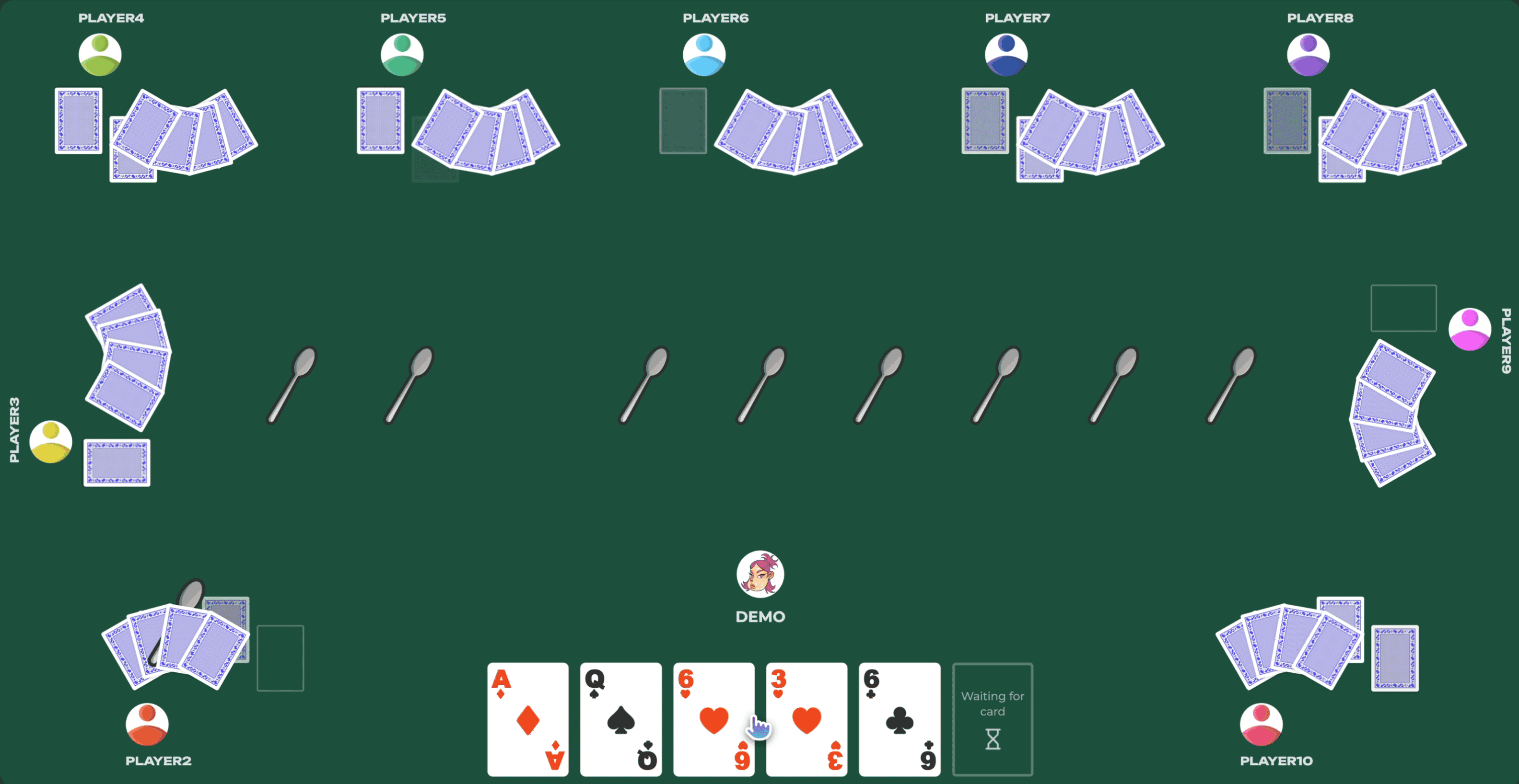 - At the end of each round, if you don’t have a spoon, you are OUT